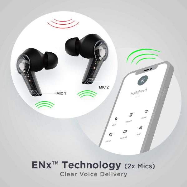Clear like a crystal. Airdopes 413 ANC comes equipped with dual mics enhanced with ENx™ Technology which greatly enhances call quality and prevents unpleasant noise from being picked up by the microphone. This results in you being heard clearly even in noisy environments.