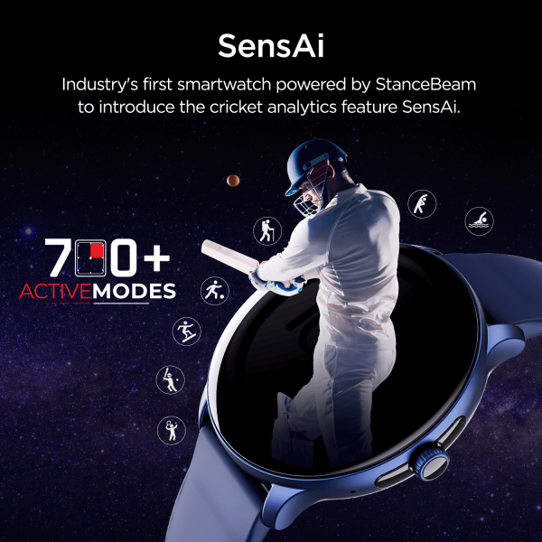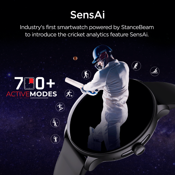 This smartwatch features SensAi powered by StanceBeam. SensAi gives deep insight into your cricket performance letting you receive the benefit of data for your cricket training. Get insights about your bowling speed, bat swing, hits and misses, angles, power and efficiency. Also, receive tips on how to make your performance better.