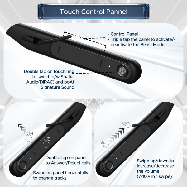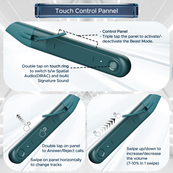 Unleash a new era of music control with the Rockerz 255 Touch, India’s first neckband featuring full touch swipe functionality. Experience the magic of DIRAC Virtuo™ technology, delivering immersive boAt Spatial Audio that envelops you in a captivating audio journey. Revolutionize your conversations with ENx™ Technology for crystal-clear call clarity, and groove non-stop with an impressive 30-hour playback time. It’s time to elevate your music experience to new heights.