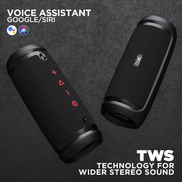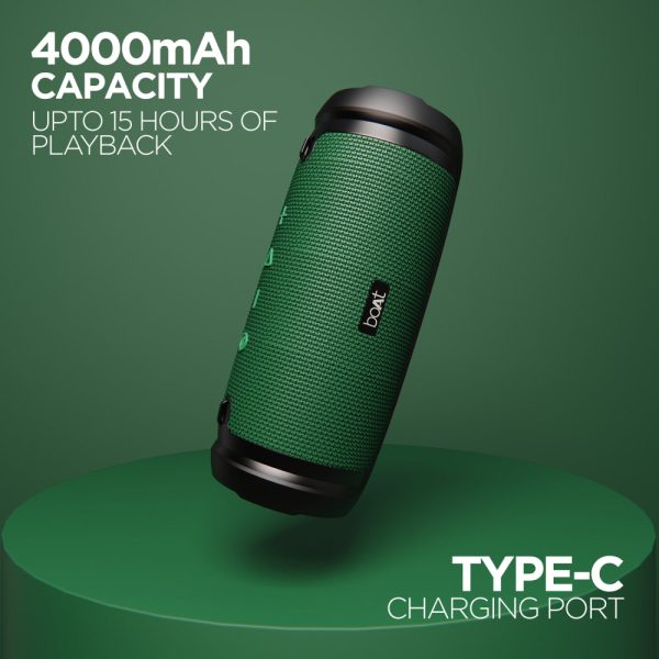 Immerse in Nirvana with boAt Stone 1508 portable wireless speaker. The speaker comes equipped with instant Bluetooth v4.2 for optimum wireless connectivity. The powerful drivers offer dynamic 40W boAt Signature Sound to enthrall you while you immerse in blissful auditory experience. The colossal 4000mAh battery helps pump out playback for up to 15 hours and the speaker comes equipped with Type-C charging port for seamless charging. Its rugged and robust design is IPX6 rated that ensures resistance against shocks or water scares.