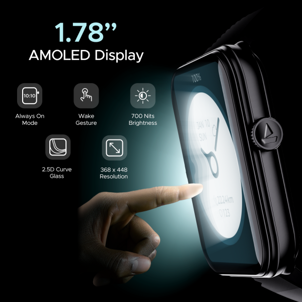 Experience clarity beyond compare with boAt Storm Plus and its 1.78” (4.52cm) AMOLED display. View rich colours of the new watch face that you choose out of the 100+ options. Forget the days of reaching out to your mobile as the bluetooth calling feature of our smart watch makes it extremely convenient to pick and make calls. Talking about convenience, keeping a tab on your health becomes easier with boAt Storm Plus calling smartwatch that features 100+ Sports Modes and health monitors that track SpO2, Sleep, and heart rate. Strap up and experience the storm!