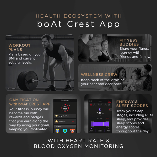 Set and achieve fitness goals for yourself with 10+ sports modes and the boAt Crest App that allows you to create fitness plans, compete with fit buddies. Whereas the heart rate sensor, blood oxygen sensor, sleep tracker takes your fitness to the next level, providing detailed analytics and more.